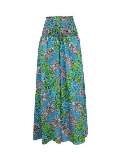 بنطال أرجل واسع ذو خصر مطاطي مزخرف بطبعة زهرية للنساء في أثناء العطلات