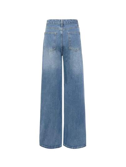 بنطال جينز أزرق كاجوال بحلية معقودة للسيدات، طراز كاجوال ذو ساق مستقيمة وفضفاضة، بنطال جينز بتصميم خريفي