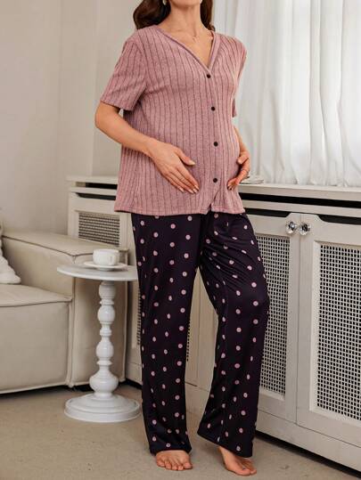 بيجاما حمل قطعتين، بنطلون قطني نقاط بولكا وسترة قصيرة الأكمام من القطيفة الناعمة فتحة أمامية، ملبس منزلي عادي