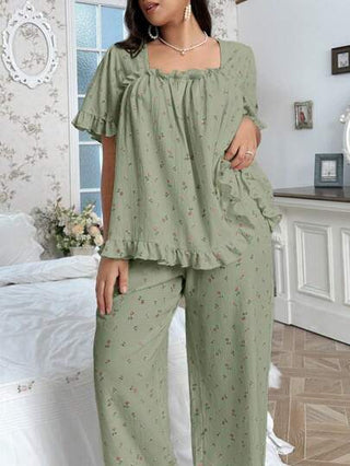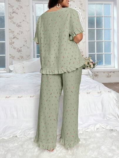 بيجامة مربعة الرقبة مزينة بفيونكة، مطبوعة بالوردة، مقاس كبير، كم قصير