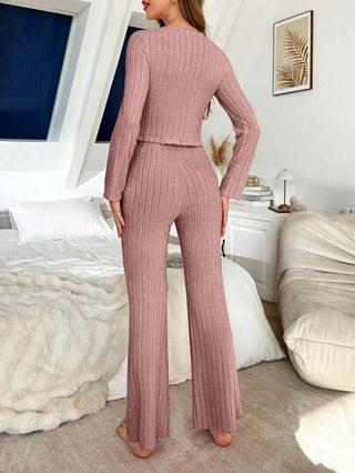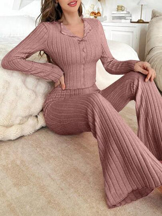 بيجامة نسائية بسروال طويل وشق طويل بأكمام وفتحة رقبة على شكل حرف V بلون أحادي