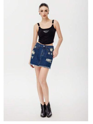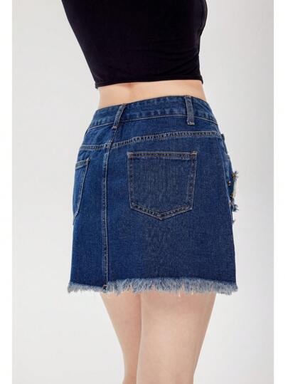 تنورة جينز أزرق كاروهات للنساء، قصيرة، خصر منخفض مخصص لرفع الخصر، حافة مبتورة، طراز برمودا عاصي، خمس نقط نجمة، بجيوب مزينة بالكبس