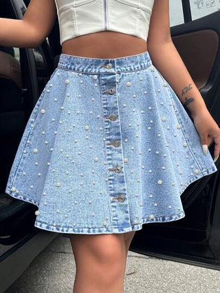 تنورة جينز بتصميم مزود بخرز صناعي أنيقة وأنيقة مناسبة للارتداء اليومي ، العودة إلى المدرسة ، الحفلات ، السفر ، المطار
