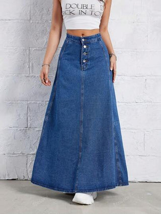 تنورة جينز مُعتَّقة ذات خط A بتصميم أنيق أحادي الصدر، تنورة طويلة مُنفرجة أنيقة ذات طابع عتيق