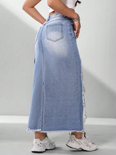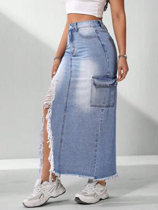تنورة جينز نسائية عصرية بتفاصيل متضررة وأطراف متقطعة
