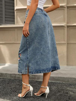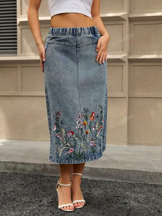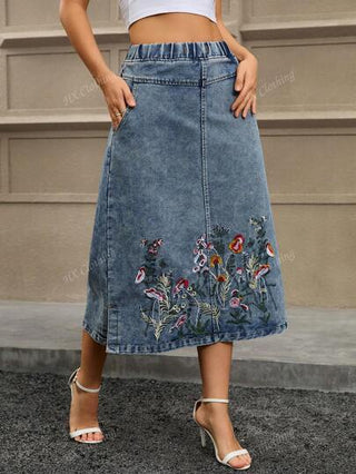 تنورة دنيم مطرزة ذات خصر مطّاطي أنيقة وأنيقة بطول متوسط للنساء