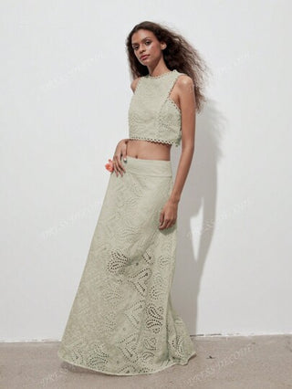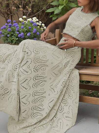 تنورة متوسطة الطول مزخرفة بالزهور المحفورة على شكل خطوط مفرغة، إيلجانت ومصقولة، لا يوجد سترة داخلية مرفقة