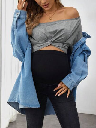 تيشيرت طويل الأكمام بكتف منخفض لحوامل مصمم بدون طباعة، نمط بسيط وكاجوال، مناسب للحمل والاستخدام اليومي