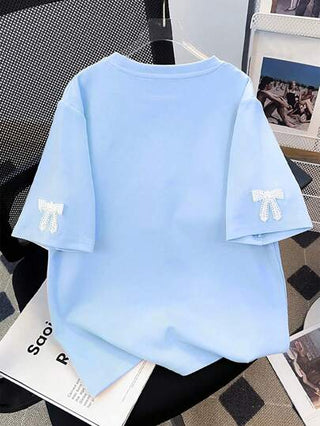 تيشيرت فضفاض كبير التصميم بياقة مستديرة وأكتاف معلقة ل- السيدات، مع تطريز يدوي بخرز يشكل فيونكة