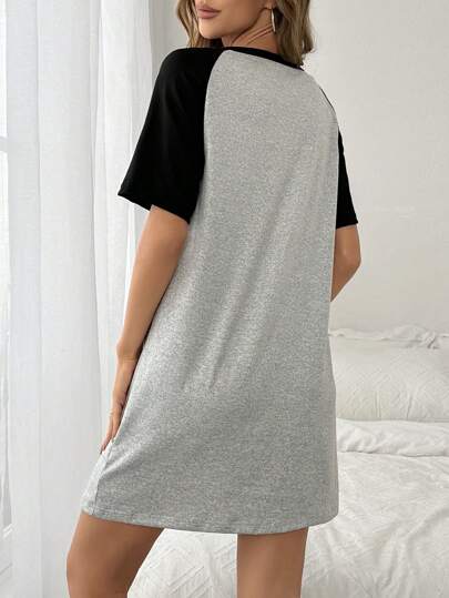تي شيرت تي قصير الأكمام مطبوع بخط بتفاصيل لوني متباينة وقميص نوم
