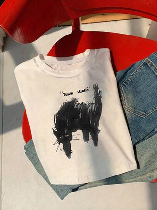 تي شيرت كاجوال بياقة دائرية وأكمام قصيرة، طباعة غرافيتي بشكل قطة كرتونية لأسلوب Y2K للنساء