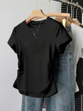 تي شيرت كاجوال للنساء بنمط ملون بالكامل، رقبة دائرية، أكمام قصيرة، كشكشة