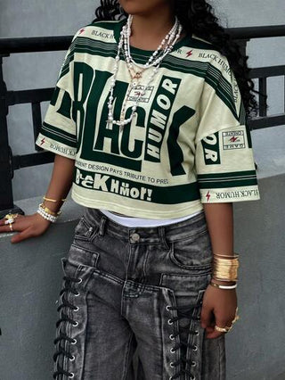 تي شيرت نسائي بأكمام قصيرة بياقة مستديرة بشكل فضفاض، مع طباعة شعار
