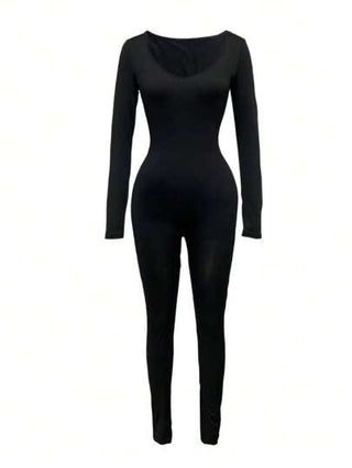 جمبسوت سوداء ذات رقبة على شكل حرف U وأكمام طويلة مناسبة للربيع والخريف