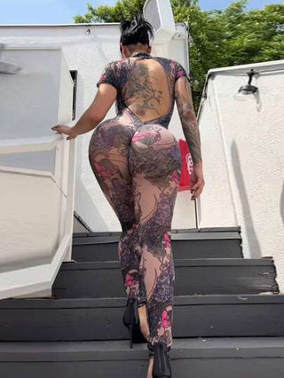جمبسوت قصيرة الأكمام شفافة بطبعات الشبكة رشيقة الشكل