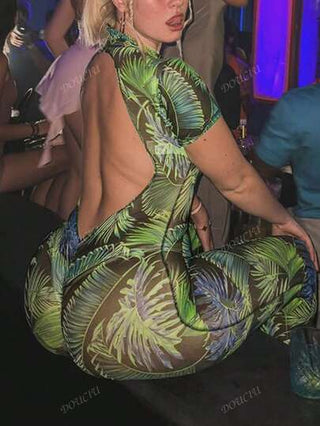 جمبسوت قطعة واحدة شفافة مطبوعة بطراز أزياء عصري بدون ظهر للنساء