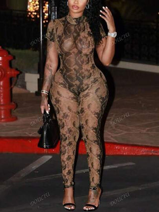 جمبسوت نسائية جريئة بتصميم ظهر مكشوف، مزينة برسومات جذابة وشبك شفاف، موضة شارع عصرية