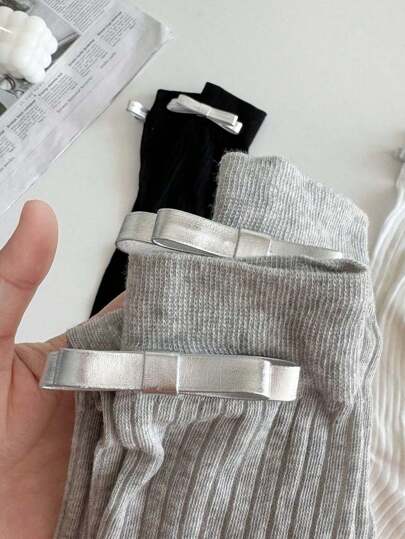 زوج جوارب للنساء من قماش شبكي شفاف قابل للتنفس بتطريز دانتيل ذات لون واحد موحد بطول منتصف الساق، مزين بفيونكة فضية بطراز ياباني JK، متعددة الاستخدام للصيف، مخطط