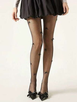 زوج من جوارب الشباك المطاطية السوداء الثقيلة بفيونكة للسيدات