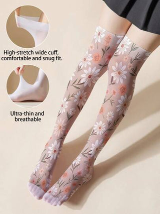 زوج من جوارب الشيفون النسائية الرقيقة جداً، المطبوعة ثلاثية الأبعاد بنقشة الأقحوان، ذات مرونة عالية وتهوية جيدة، بلون الجلد مع طباعة زهرية على مدار 360 درجة عبر الركبة، تصميم حصري لفصل الربيع والصيف