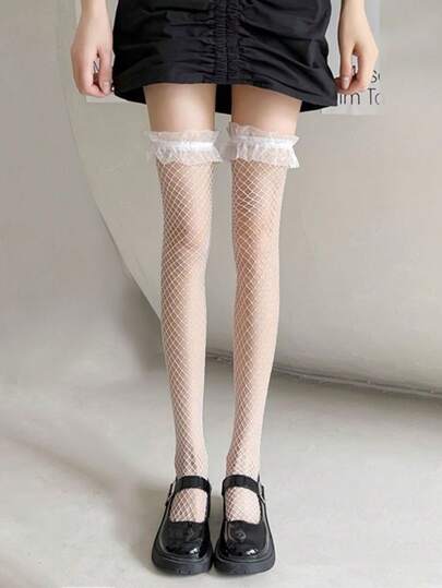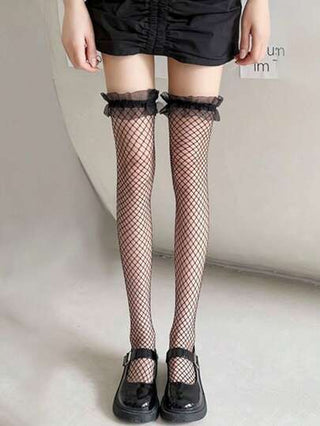 زوج من جوارب شبكية ساتر فاتح مطرزة بالتفاصيل السوداء للنساء، بنمط لوليتا الرقيق