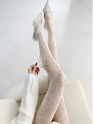 زوج من جوارب شفافة بتصميم فرنسي عتيق باللون الأبيض مع باقة زهور ، وجوارب شبكية سوداء جذابة مفتوحة البرقعة باللون البني