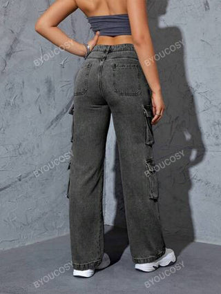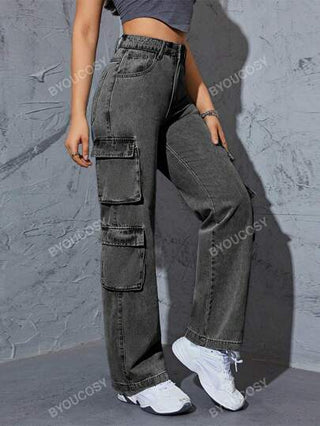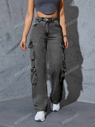 سروال جينز نسائي مستقيم ذو خصر عالي وعدة جيوب من نمط Y2K العصري للمرأة