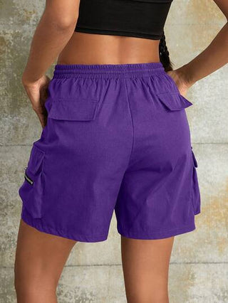 شورت رياضي أزرق غامق أحادي اللون ، شرائط ربط ، خصر مطاطي ، جيوب بغطاء ، تفاصيل سوستة ، ساق مستقيمة ، صالح للارتداء اليومي العادي الصيفي ، شورت كاجوال فضفاض ل-لنساء