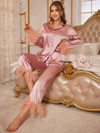 طقم بجامة من الساتان بتقويرة ريش