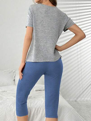 طقم بيجاما مكون من بنطال كابري ضيق وقميص بأكمام قصيرة مع زخرفة فيونكة وأزرار أمامية نصفية