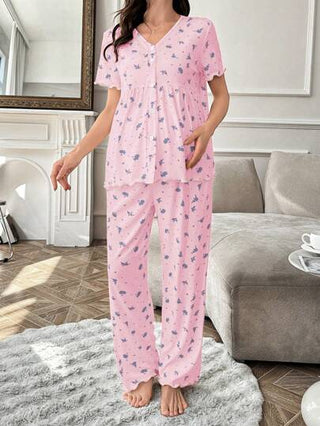 طقم بيجامة الحمل منقوشة بأزهار رومانسية مع كشكشة، توب بياقة V و أكمام قصيرة و بنطال طويل