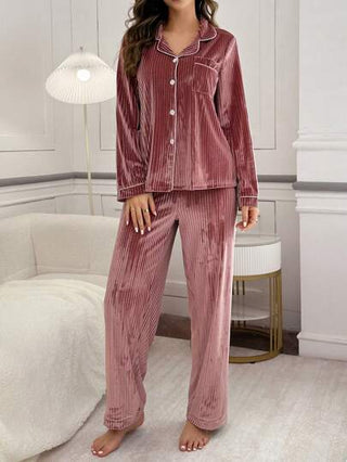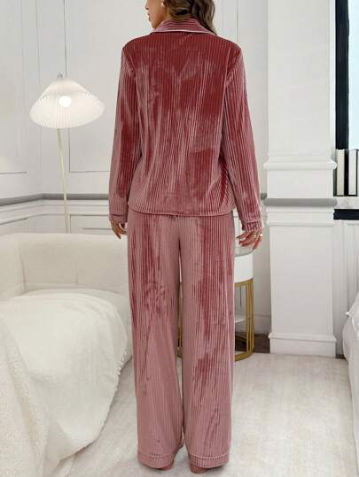 طقم بيجامة ذو رقبة شال من القطيفة باللون الواحد