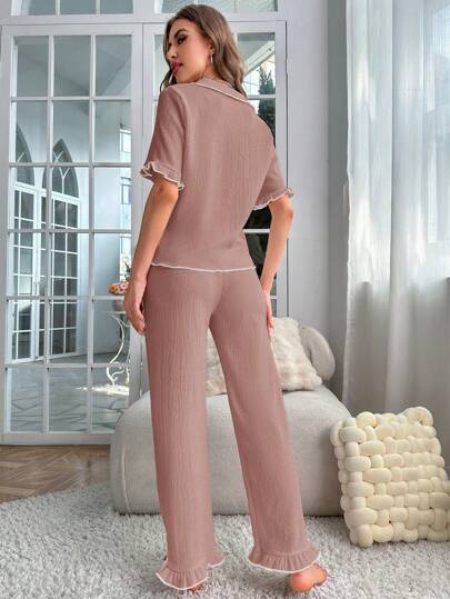 طقم بيجامة مع حافة رباط تباين وأكمام منفرقعة وذيل متموج