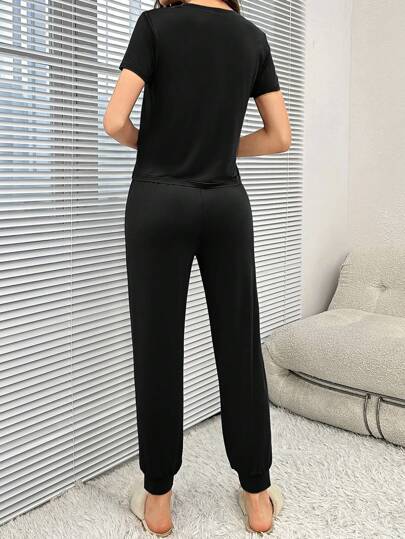 طقم بيجامة من قميص بطباعة حرفية وبنطلون بخصر رباط