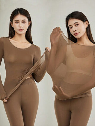 طقم حراري لون بني بن من قطعة واحدة تتكون من كم طويل والبنطلون ، صديق للبشرة وناعم ، مناسب للاستخدام اليومي في الشتاء