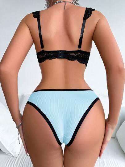 طقم حمالة صدر بدون أسلاك كاجوال للنساء من القطعتين بتصميم رقعة من الدانتيل