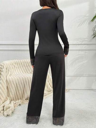 طقم ملابس نوم كاجوال للنساء مكون من ملابس علوية بأكمام طويلة ولباس سفلي مصنوع من رقعات الدانتيل