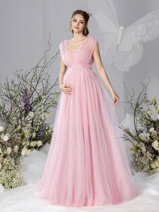 فستان أماكسي للحوامل بدون أكمام وكتف مكشوف مع تنورة تول كبيرة، قماش شيفون خفيف للربيع/الصيف لحفلات استحمام الطفل والتصوير الفوتوغرافي للحامل (سيلويت خط A المبهج، أناقة رومانسية سماوية )