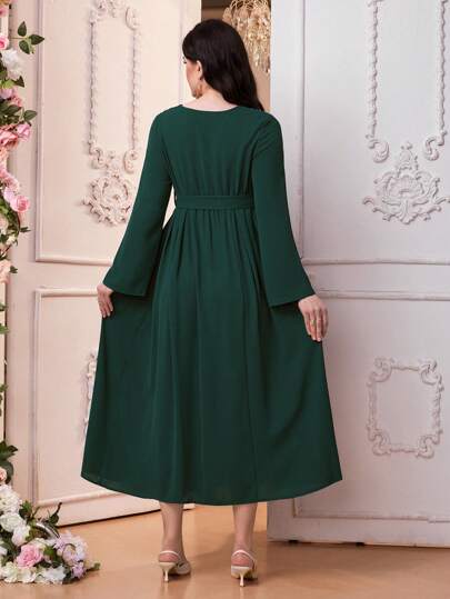 فستان أنيق خط أيه بأكمام واسعة مع تطريز زهري على الرقبة الواي بتصميم خاص للحمل