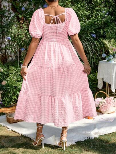 فستان الحمل مخطط ذو أكمام منتفخة وياقة مربعة، أزرق