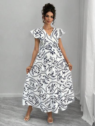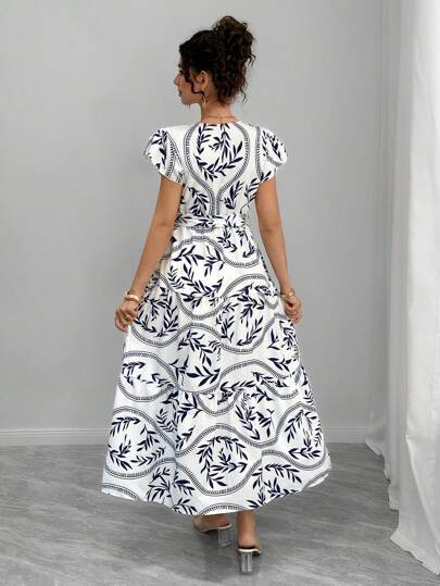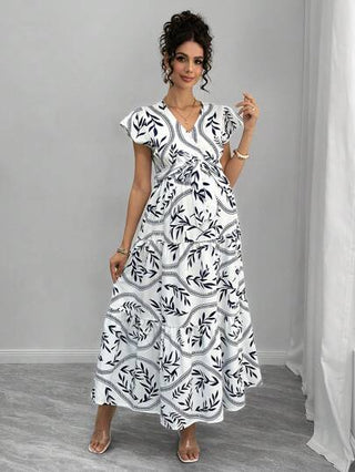 فستان حمل بأكمام متدلية مع ياقة على شكل حرف V وربطة للخصر، متعدد الطبقات بطباعة رقمية على شكل كعكة طويل