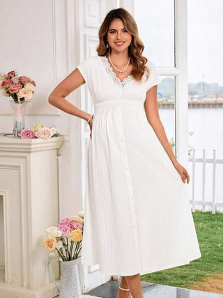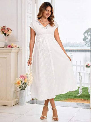فستان حمل بلون أحادي مع رقبة على شكل V ونسيج دانتيل مهيأ، فستان لحفلة استقبال الطفل