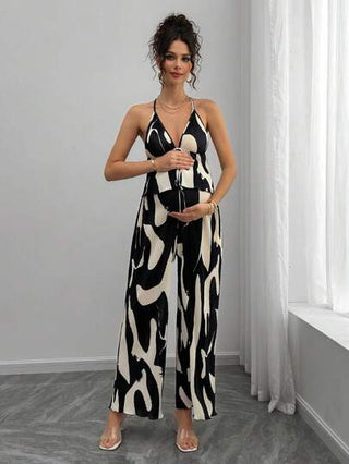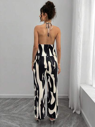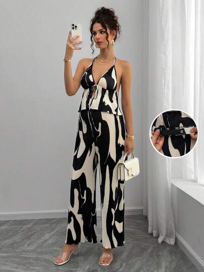 فستان حمل بياقة حلقة مربوطة أمامي مطبوع بالكامل وبنطلون خصر قابل للتعديل، طقم جذاب من قطعتين، صيف