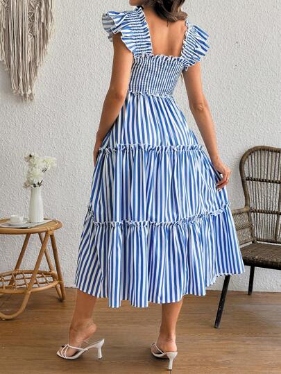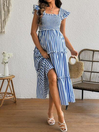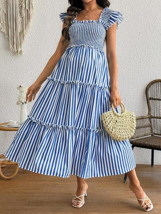 فستان حمل كاجوال للسيدات الحوامل بياقة مربعة ذو أكمام قصيرة وزخرفة كشكش وخطوط