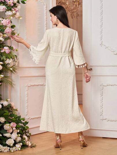 فستان حمل لون سادة باتش وورك منقش بشراشيب، بسيط وكاجوال