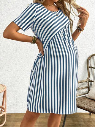 فستان حمل مخطط بأكمام قصيرة وياقة دائرية للنساء
