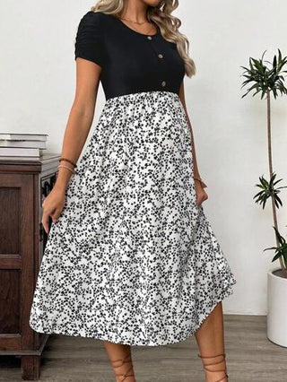 فستان سترة غير رسمي قصير بتصميم أزرار وزهور صغيرة لأيام الحمل، مرتدي في أثناء العطلات