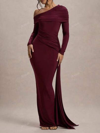 فستان سهرة أنيق و عصري للحفلات بأكمام طويلة ياقة غير متماثلة وتصميم مطوي للجسم، مناسب لحفلات الزفاف والحفلات الرسمية والسهرات