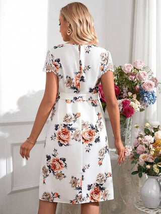 فستان ضيق البنطلون للأمهات بياقة مستديرة وأكمام قصيرة، مرقع بالدانتيل ملابس علوية الركبة، للمناسبات الرومانسية المميزة