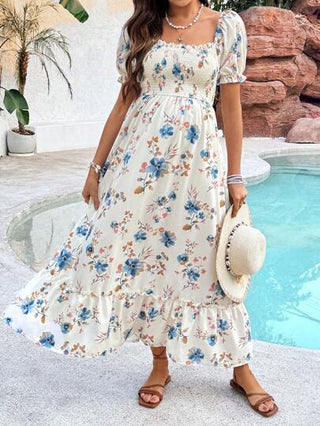 فستان طويل كاجوال نقشة زهور كاملة، أكمام منتفخة، للأم الحامل للإجازة